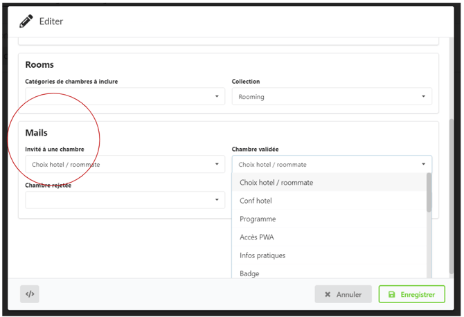 - Invité à une chambre : Ce mail sera automatiquement envoyé au participant invité à partager une chambre