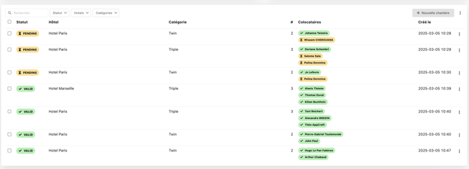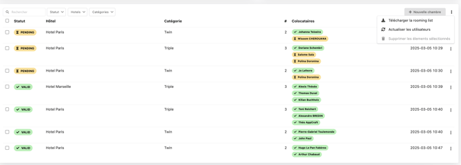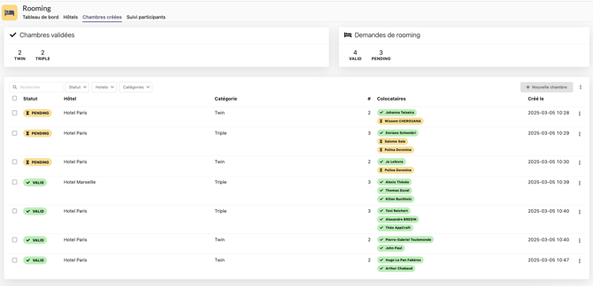 L'onglet chambres créées vous permet d'avoir une vue globale de votre rooming, faire vos exports et si besoin, attribuer des chambres depuis le backoffice