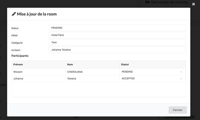 Une popup va s'ouvrir avec les informations de la chambre, et le statut pour chaque participant