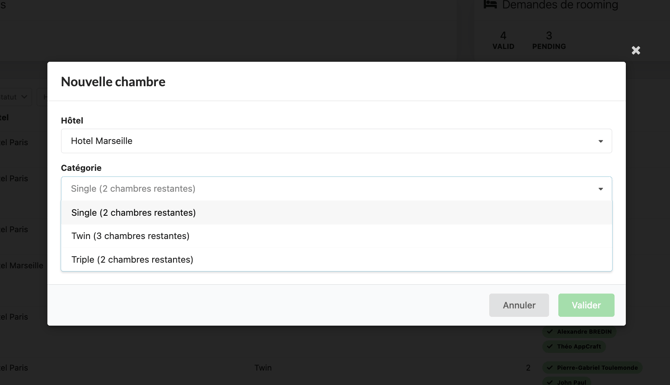 Vous avez la possibilité de créer et attribuer en backoffice des chambres aux participants, dans les hôtels disponibles
