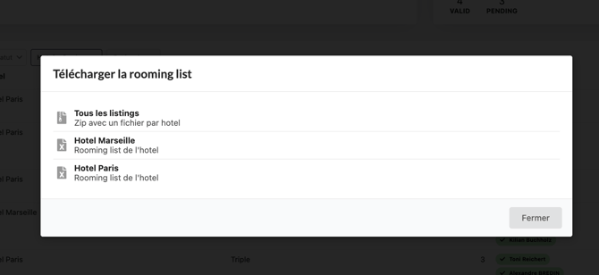 Vous pouvez, depuis l'onglet chambres créées, exporter les rooming listes :
