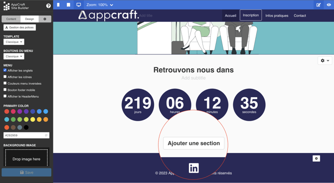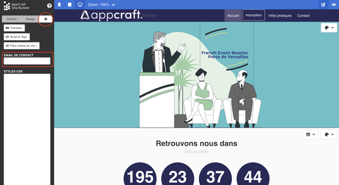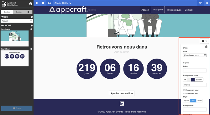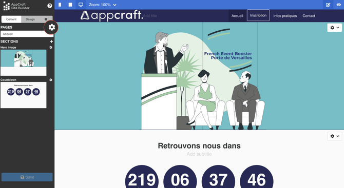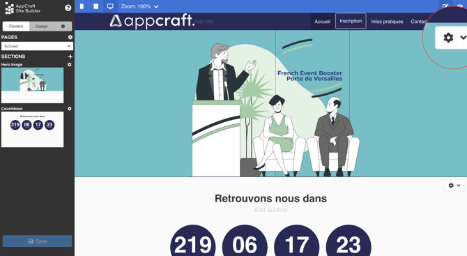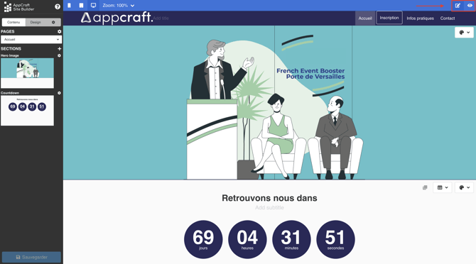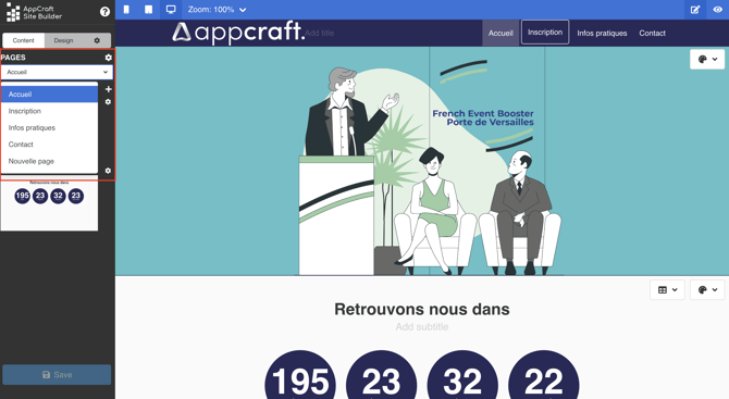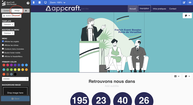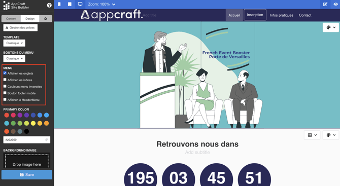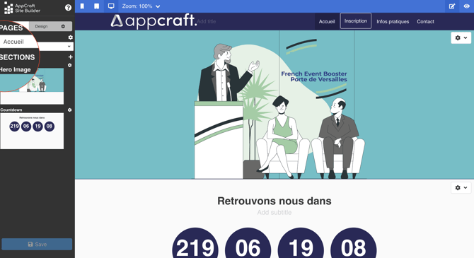L'éditeur de site AppCraft Events est simple d'utilisation est intuitif. Il vous permettra de créer et modifier votre site en quelques clics.