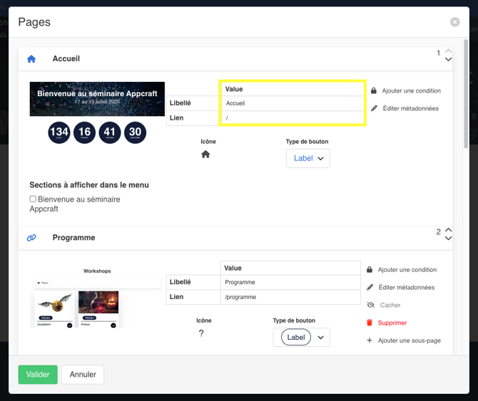 - Libellé : C'est le titre de la page qui apparaittra dans le menu de votre site