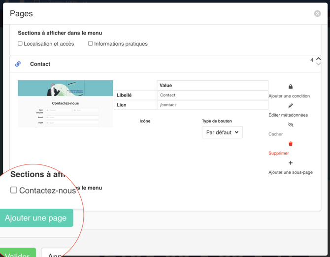 Vous pouvez également ajouter des sections via le bouton Ajouter une section en bas de chaque page.