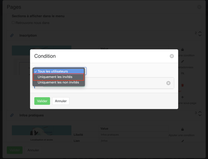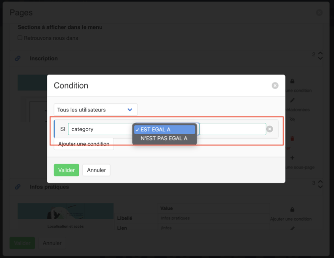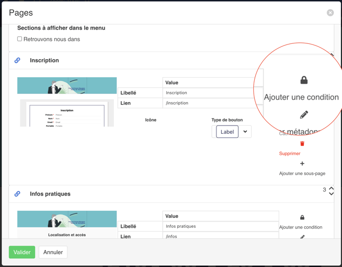 Vous pouvez conditionner vos pages via le cadenas (pour en savoir plus sur le fonctionnement du conditionnement, nous vous invitons à consulter cette page):