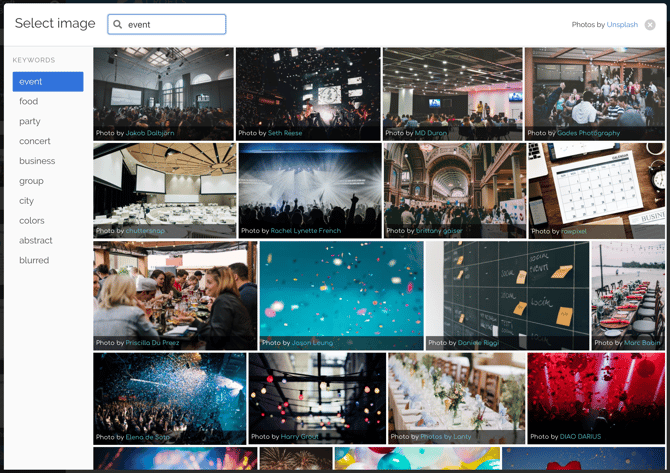 La bibliothèque d'image repose sur Unsplash et propose uniquement des images libre de droit. Sur la gauche, le menu propose certains mots-clés couramment utilisés par nos utilisateurs.
