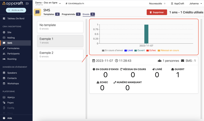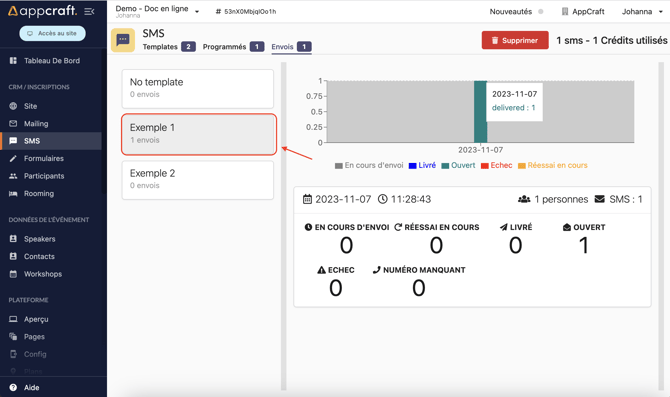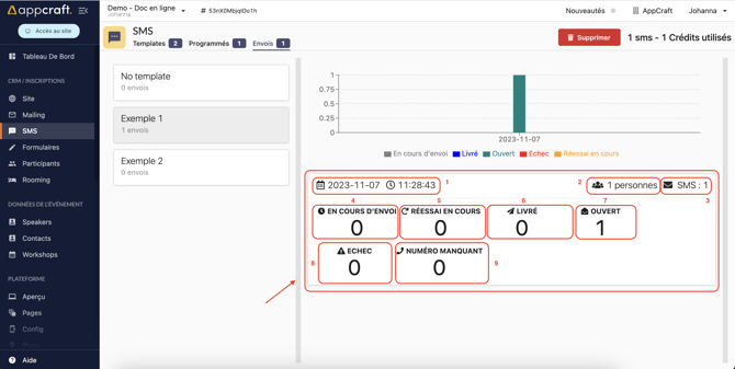 La zone de gauche vous permet d'avoir une vue d'ensemble sur tous les templates de SMS et du nombre d'envois effectué par template.