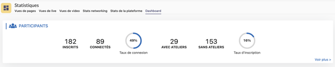 Le dashboard permet de donner quelques chiffres rapides concernant les participants et la connexion de ceux-ci