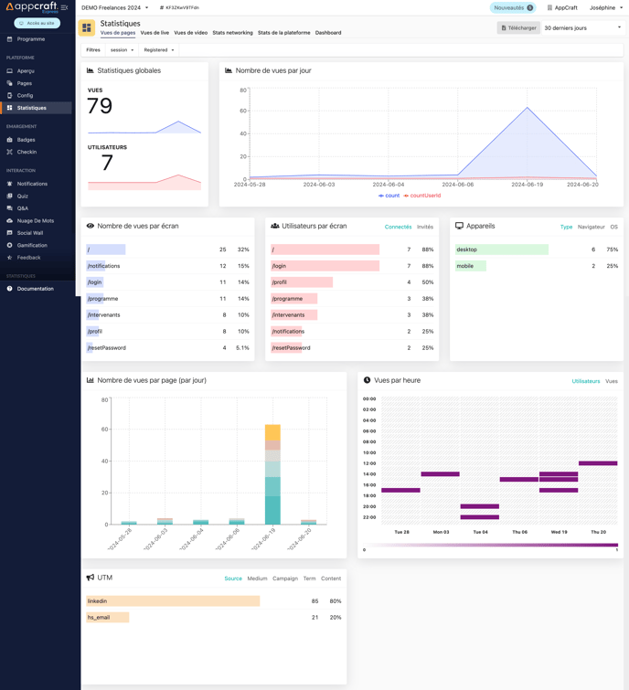 The "Page views" tab displays all statistics relating to page views on the platform / PWA, broken down by page, by time, by day... as well as the type of device used by participants.